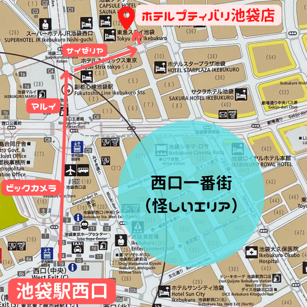 一本路地裏に入るとラブホが点在しているエリアで、今回行くプティバリもこの中にあります。元々土地勘がある場所なので、すんなり行きましたが、慣れていない方は予習してからがいいと思います。また、西口一番街のエリアは治安がよろしくないので、(特に夜は)通らない方がいいと思います。別に怖い目に遭うわけではないですが、強引なキャッチは多いです。個人的なおすすめの行き方は以下の通りです。